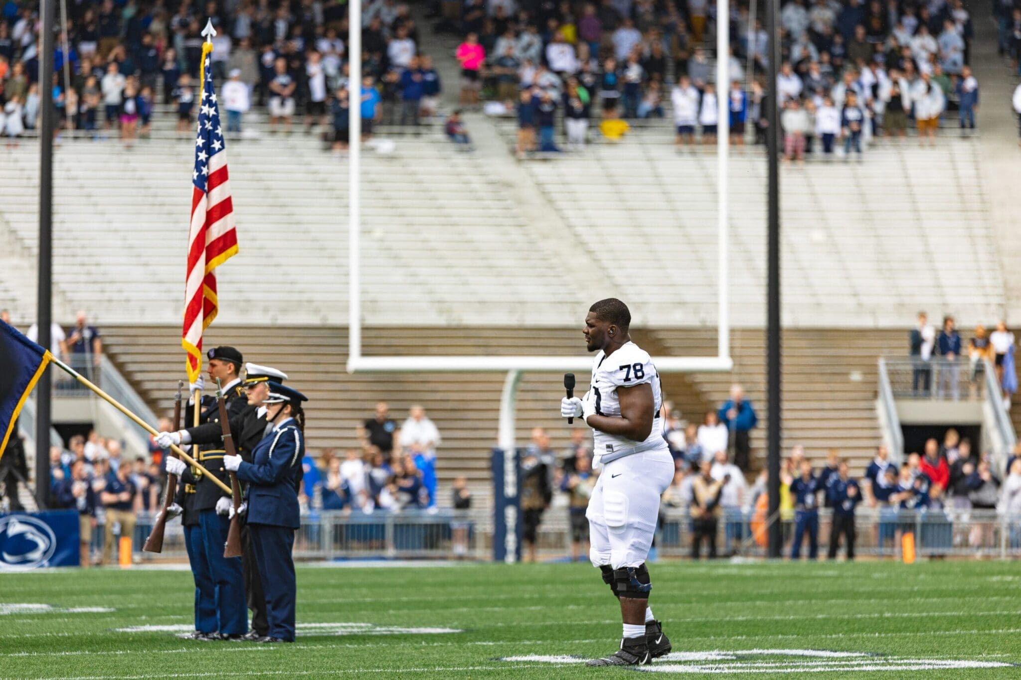But before Saturday’s Blue-White Game at Beaver Stadium, the celebrated Blue Band listened while a talented singer belted out the anthem.