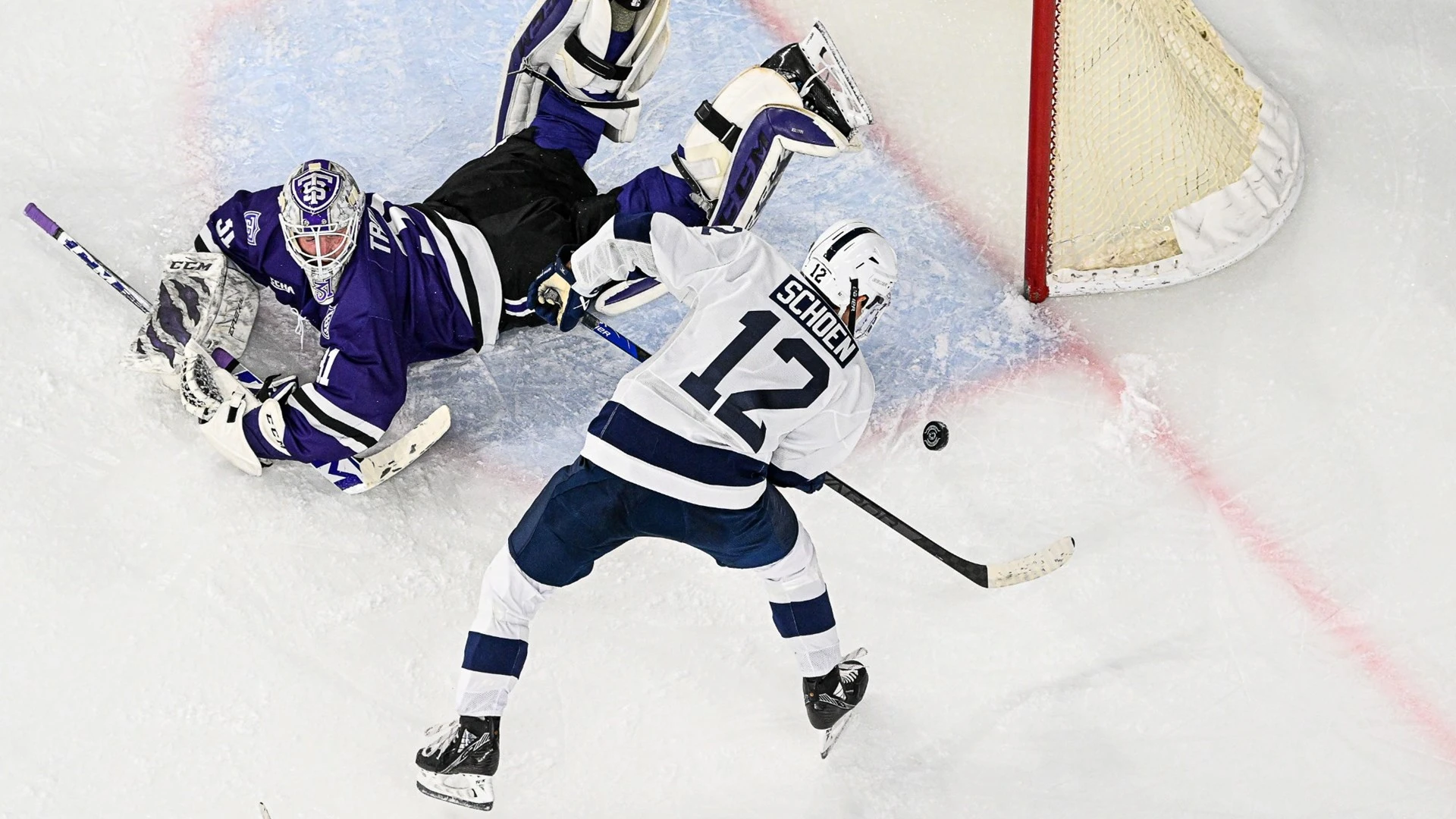 Schoen had his breakout tonight. After being assessed with a five-minute major, Schoen had an impact play out of the box to tie it at two and then netted a second goal in the third period.